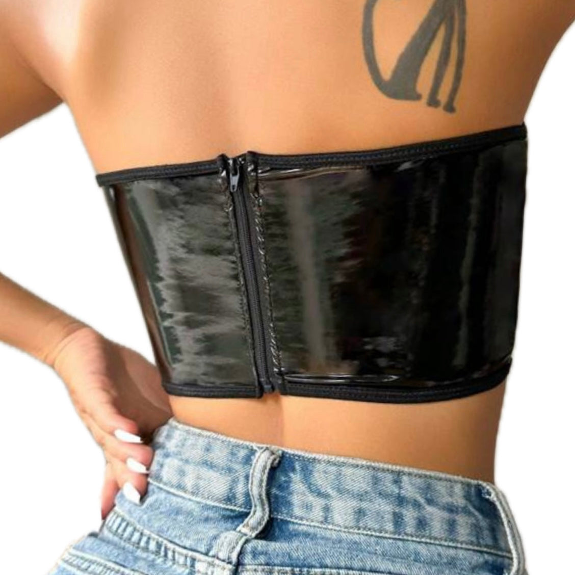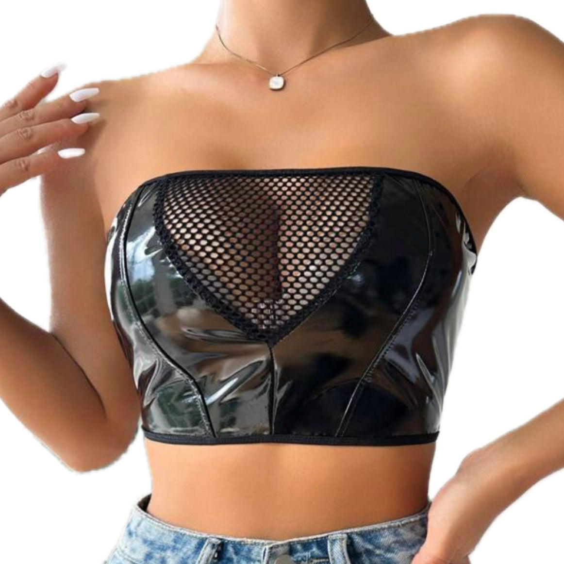 Blusa strapless de cuerina, con detalles de fishnets