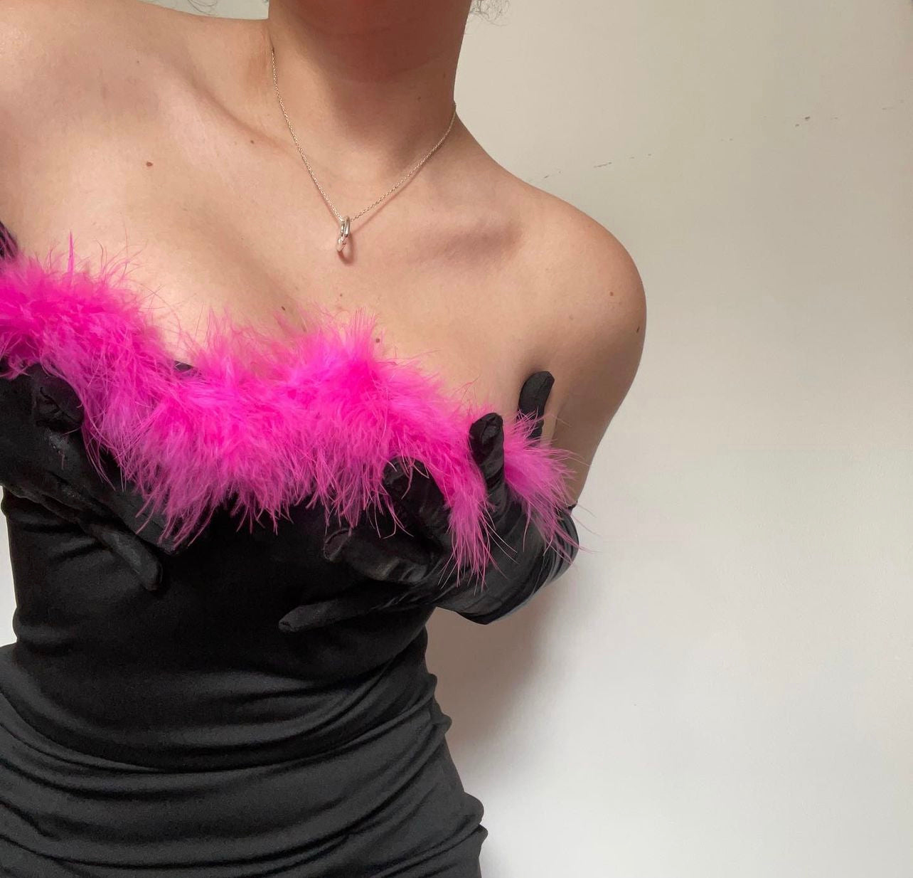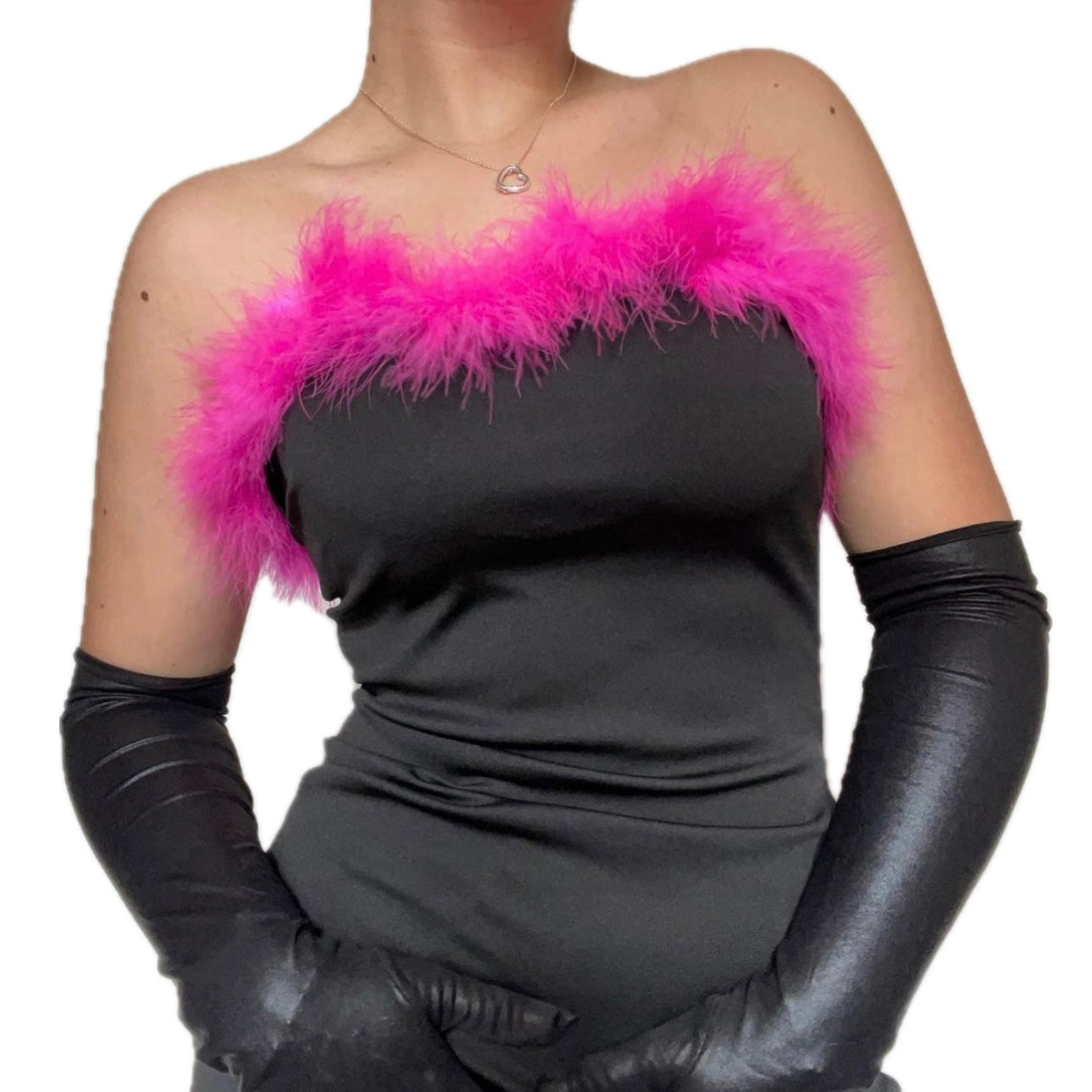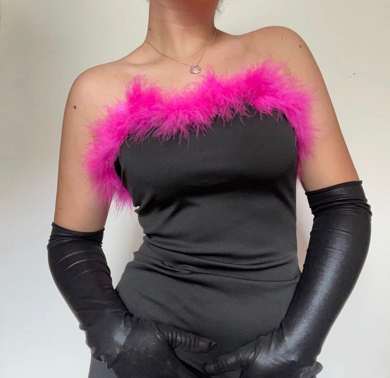 Vestido de licra pegado al cuerpo negro con plumas rosadas